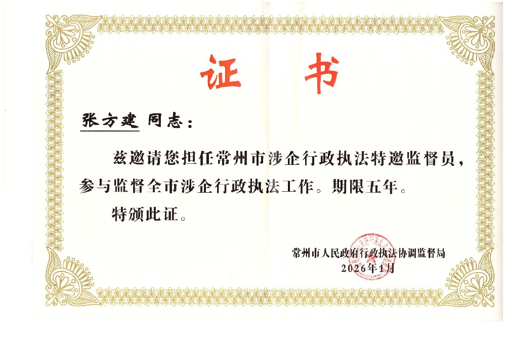 常州市涉企行政執(zhí)法特邀監(jiān)督員證書