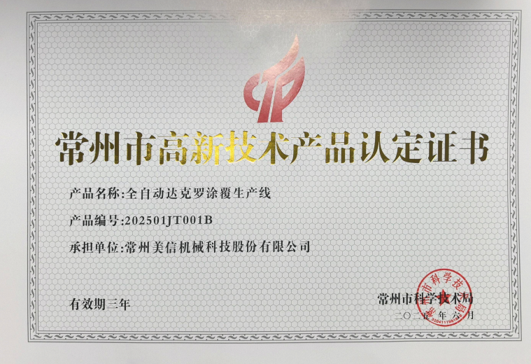 全自動(dòng)達(dá)克羅涂覆生產(chǎn)線(高新技術(shù)產(chǎn)品認(rèn)證證書)